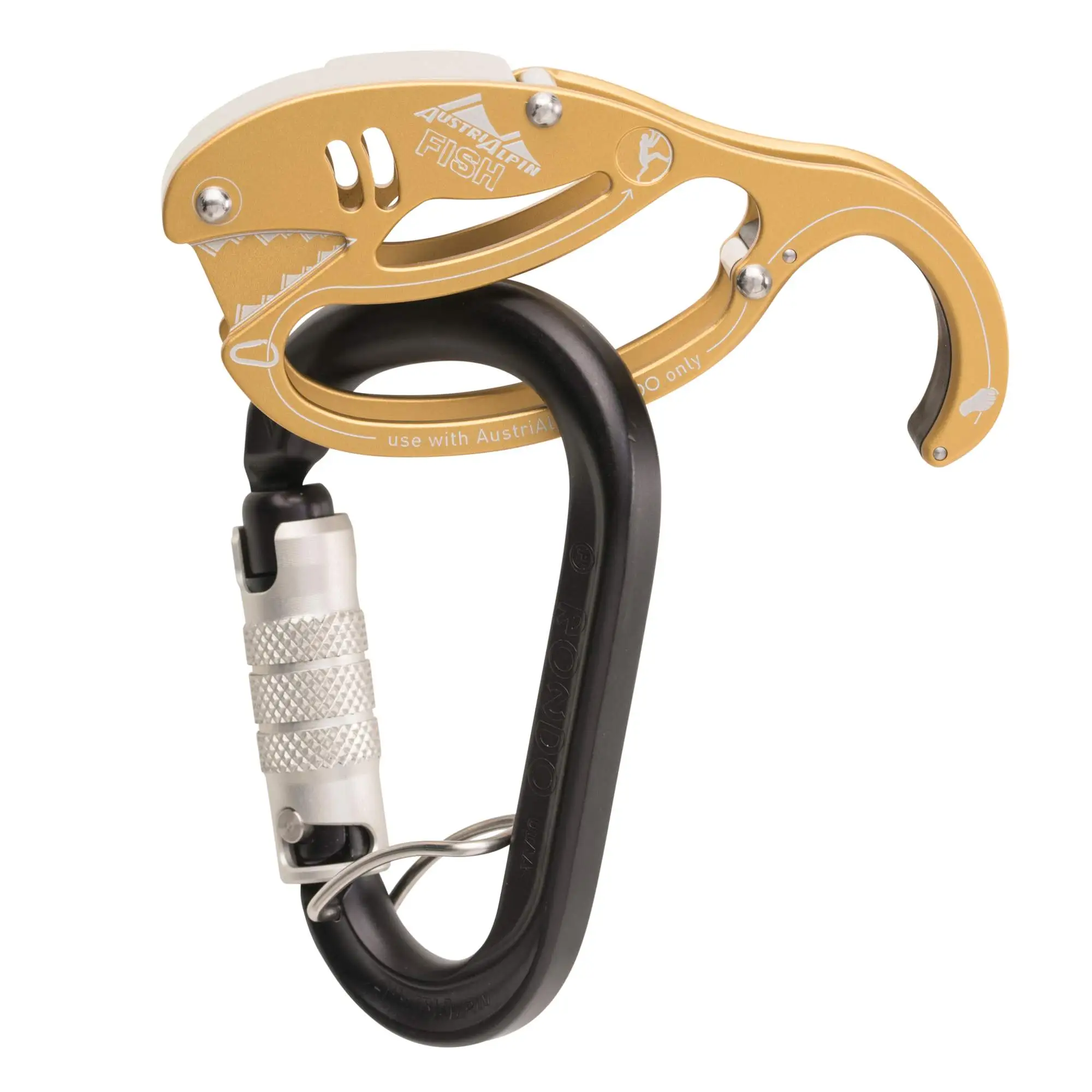 Der Gold Fish sollte ausschließlich mit dem mitgelieferten HMS-Karabiner Rondo Selfie 3-Wege-Autolock verwendet werden, um ein uneingeschränktes Blockieren zu gewährleisten. Dieser ist mit einem Metallbügel ausgerüstet, der ein Verdrehen verhindert. Er hat außerdem eine spezielle Hard Coat-Beschichtung bekommen, die doppelt so dick ist wie gewöhnliche Beschichtungen und zudem eine höhere Grundhärte. Dadurch ist er für den Dauereinsatz perfekt gewappnet!