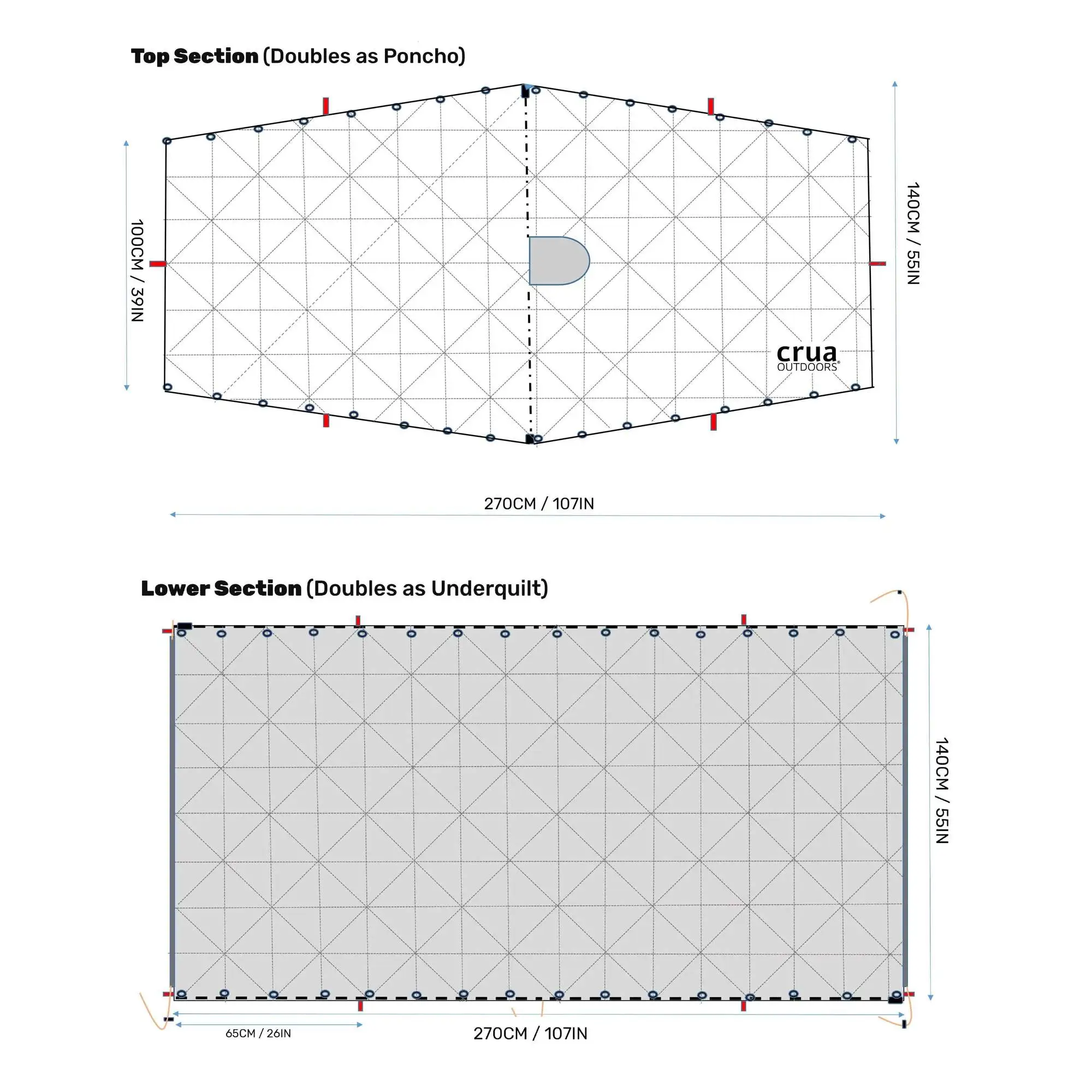• Oberer Teil als Isolations-Poncho verwendbar (mit Kapuze)