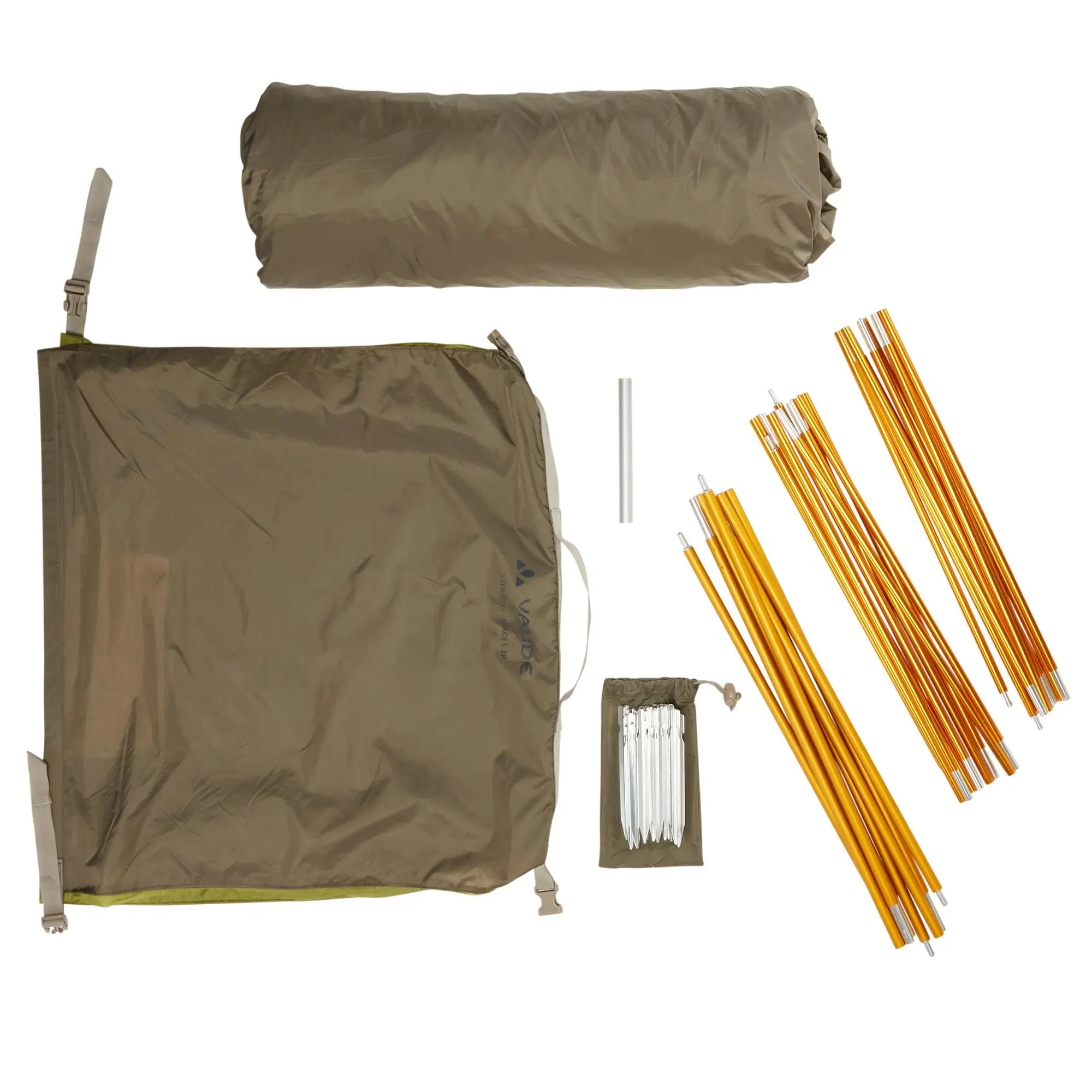 Space L 3P, Packbeutel, Heringe, Gestänge, Abspannleinen, Reparaturhülse